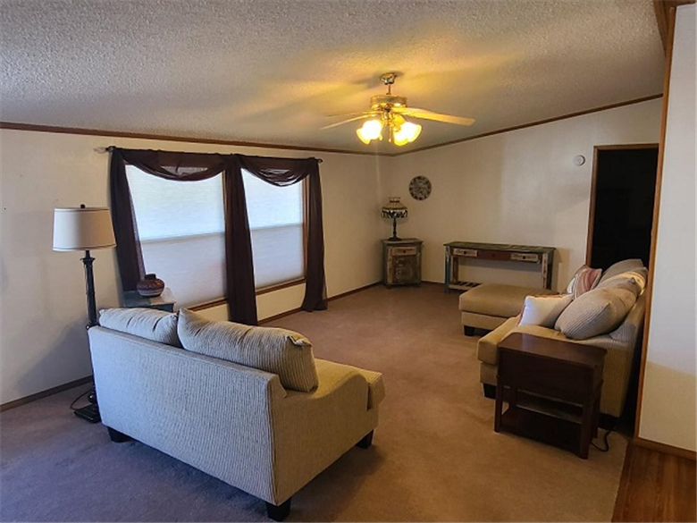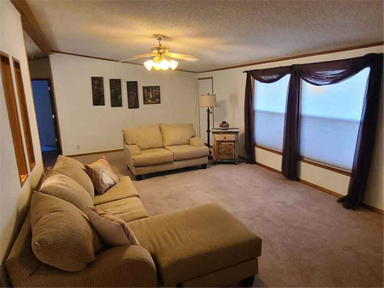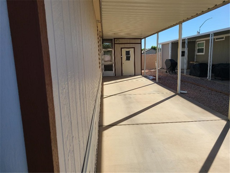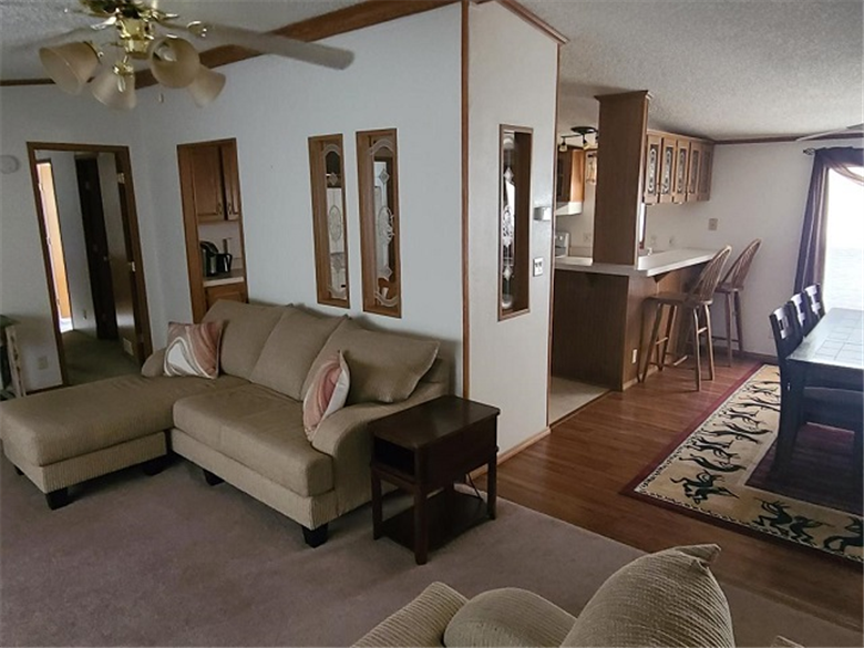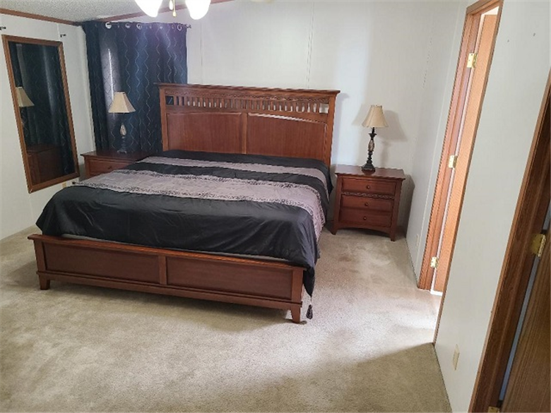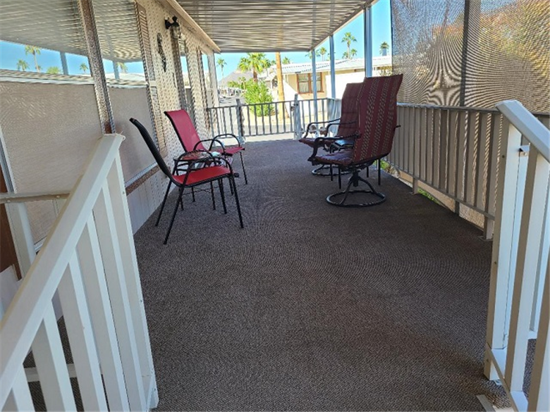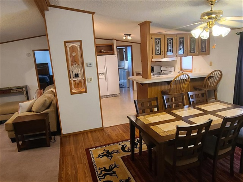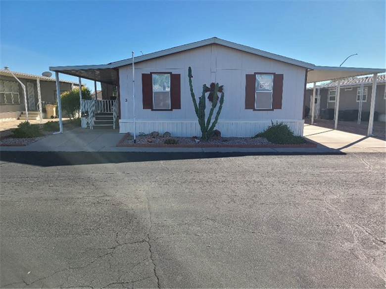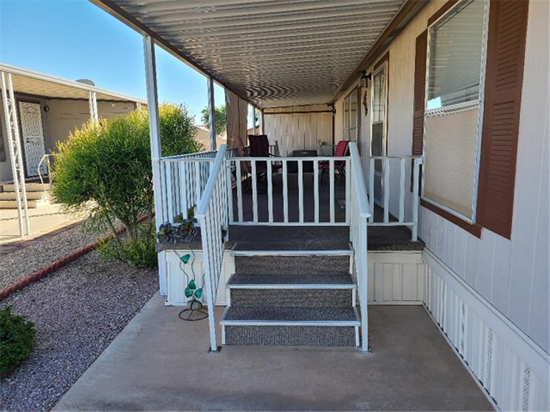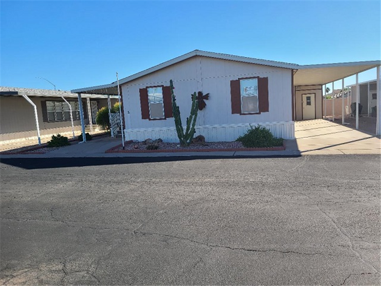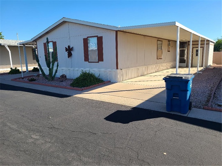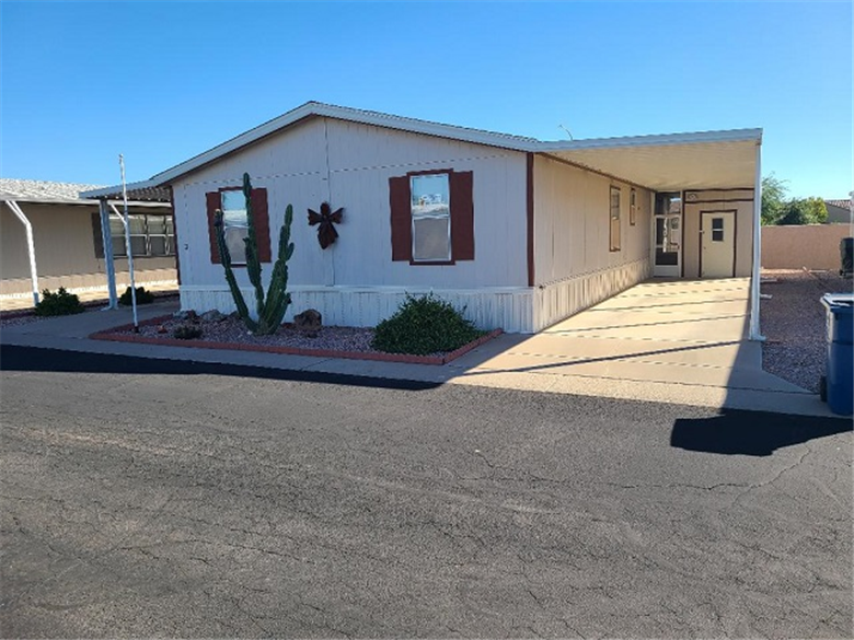 Spacious and charming 1998 Cavco 28x60 3bed/2ba located in gated, pet friendly 55+ community! Popular split bedroom floor plan with vaulted ceilings throughout! Newer heat pump installed in July of 2022! Large living area with formal dining room! Large kitchen loaded with cabinets and counter space offers a side-by-side refrigerator with water and ice, a smooth top range, microwave, and Bosch dishwasher with a breakfast bar which has lovely etched glass overhead cabinets! The formal dining room has lovely easy care wood laminate flooring, and the included dining set has seating for up to 8 people! Off the kitchen is a huge laundry room with overhead cabinets and an additional set of base and overhead cabinets for extra storage and folding counter! The master bedroom has a huge walk-in closet and a step-in shower, skylight, and linen closet in the master bath! Both guest bedrooms are large and can accommodate larger beds! There are full length awnings on the patio and carport and a large deck on the patio! There is a large workshop with electric on the carport and big storage room on the patio side! A beautifully maintained home ready for its new owner!